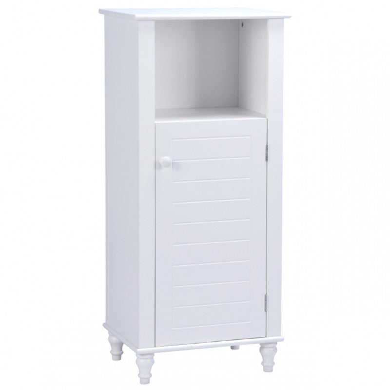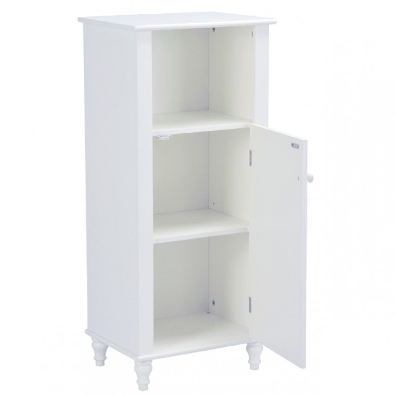Add an element of style to your bathroom decor with the refined simplicity of the Columbus IV side cabinet. With this 24 x 18w x 30 "cabinet, you can instantly expand your bathroom stoarage space. This rectangular cabinet showcases an open cubby shelf which is great for storing candles. Behind the hinged door your will find ample out of sight storage space. A smooth white coating with solid wood carved legs and a durable MDF wood design will complement your space for a long time.